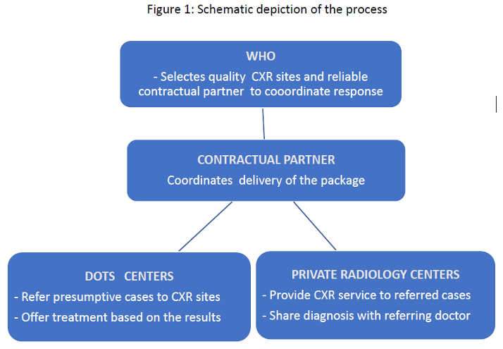 The intervention consisted of identification of quality CXR service providers as per recommendation of the TB experts from Yangon, WHO hired a “Contractual Partner” to coordinate with the identified service providers. The offer was CXR testing without cost to Presumptive TB or during follow up tests. Contractual Partner then reimburses USD 10/CXR to facilities conducting the X-ray based on verification of document submitted. WHO examines the claims on case - by - case basis as per its norms, standards and processes before further disbursement to contractual partners.