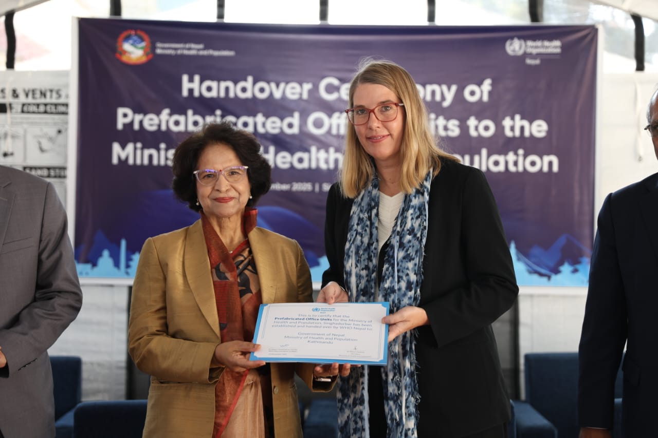 The World Health Organization (WHO) today officially handed over a newly constructed prefabricated office facility to the Ministry of Health and Population, Government of Nepal, to facilitate the resumption of critical health governance and administrative functions.