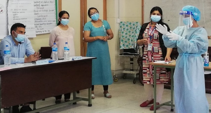 Photo Caption: Demonstration of proper donning and doffing of Personal Protective Equipment during the Pediatric Essential Critical Care Training at Kanti Hospital; Photo Credit: WHO Nepal/M. Karmacharya