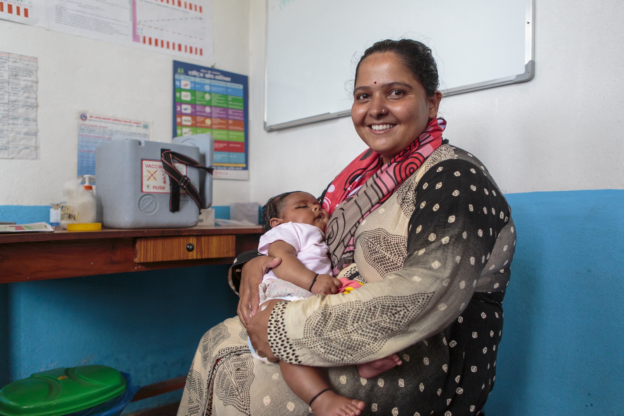 A mother and her three-month-old baby at the Tathali Health Post, Bagmati Province, Nepal; Photo Credit: WHO/C. McNab
