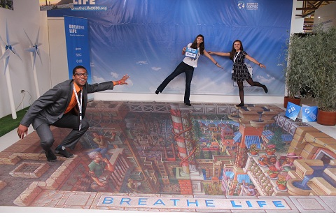 The exhibit features a 3D street graphic from the famous street artist Kurt Wenner, illustrating scenes from clean and polluted cities, “solutions” mobiles and windmills and a virtual “bike tour” of cities around the world, which you can experience while pedalling a stationary bike. The traveling exhibit is part of the WHO and UN Environment-led BreatheLife campaign encouraging cities and countries to commit to achieving WHO Air Quality guidelines. Some two dozen cities have already joined the BreatheLife campaign including major cities in Mexico (Guadalajara in Jalisco State), Chile (Santiago) and most recently, Manchester, United Kingdom.