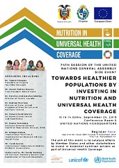 The side event is co-hosted by Uruguay, Ecuador, and the European Union. The event is co-organized by the World Health Organization, the Scaling Up Nutrition Movement, and UNICEF. The event is open to Member States missions in New York, and representatives from the UN system, business, civil society, financial institutions, regional bodies, parliamentarians and donors.