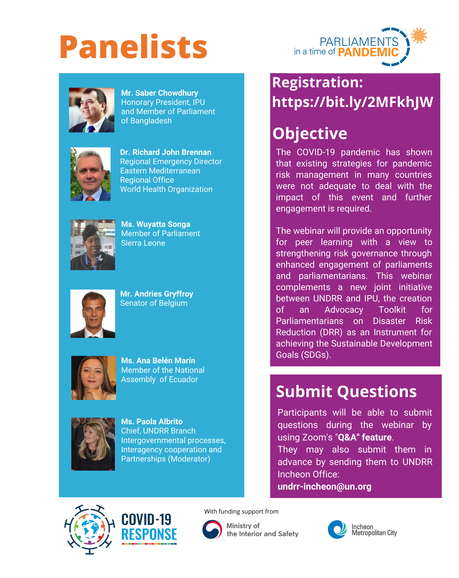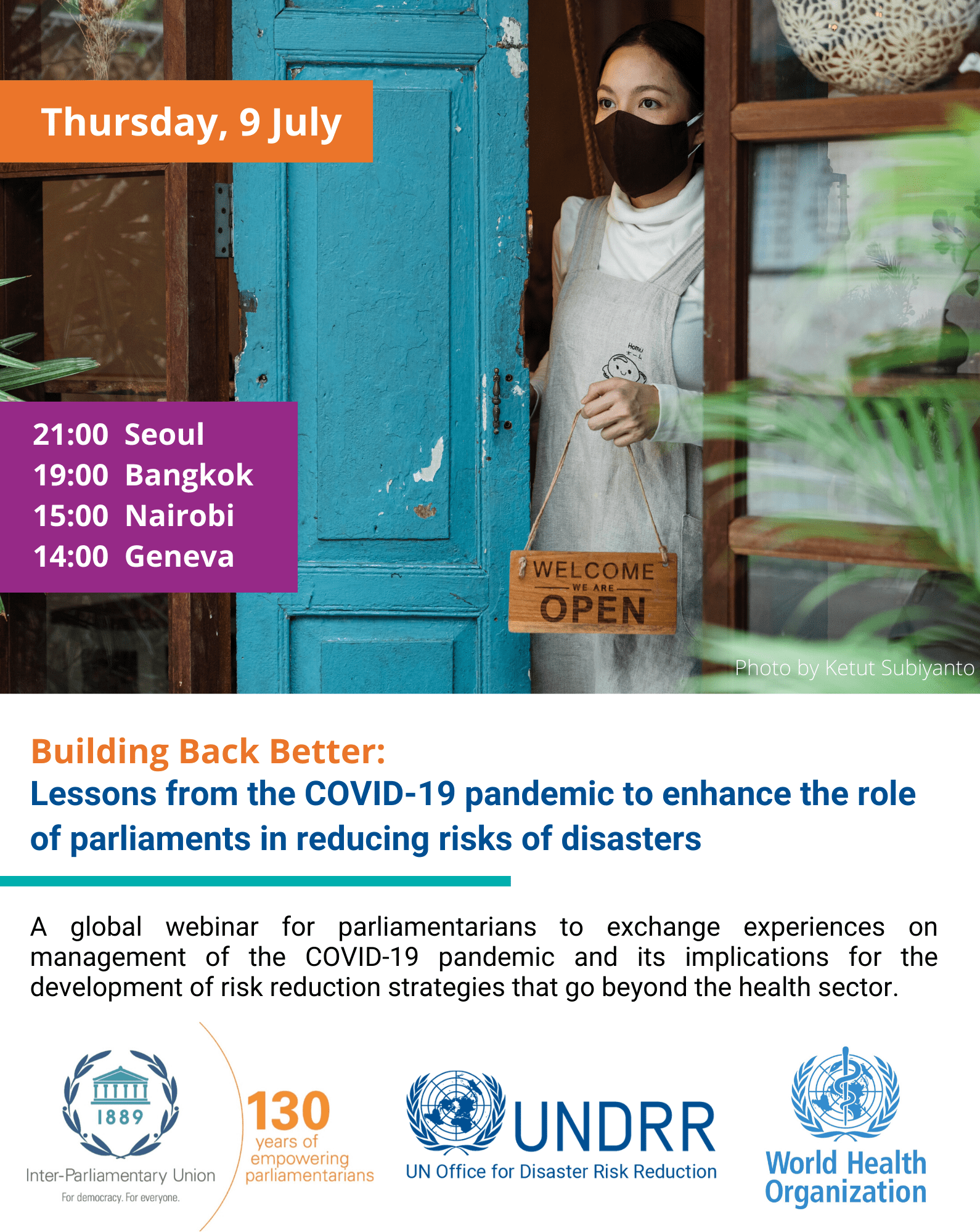 The webinar will present, from a parliamentary perspective, country experiences of the management of the COVID-19 pandemic and the implications for the development and implementation of DRR strategies to build back better engaging the sectors beyond health. The webinar will therefore provide an opportunity for peer learning with a view to strengthening risk governance through enhanced engagement of parliaments and parliamentarians. This webinar complements a new joint initiative between UNDRR and IPU, the creation of an Advocacy Toolkit for Parliamentarians on Disaster Risk Reduction (DRR) as an Instrument for Achieving the Sustainable Development Goals (SDGs).