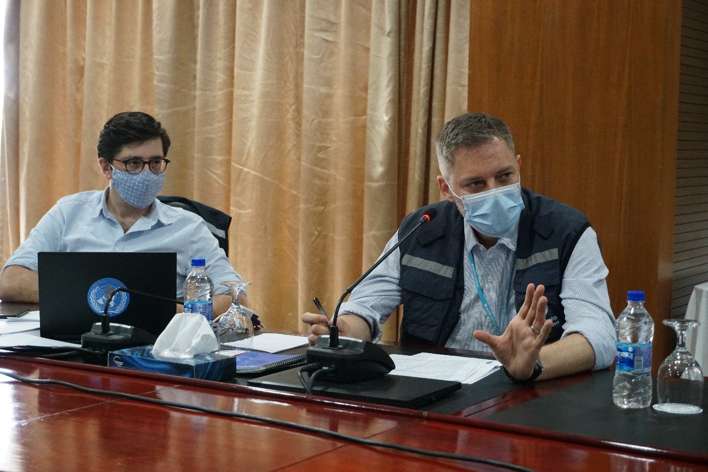 WHO Health Sector Coordinator Dr Egmond Evers (left), and WHO Head of Sub-Office, Dr Kai von Harbou (right), facilitating the Intra Action Review meeting held in Cox’s Bazar. WHO Bangladesh/Tatiana Almeida