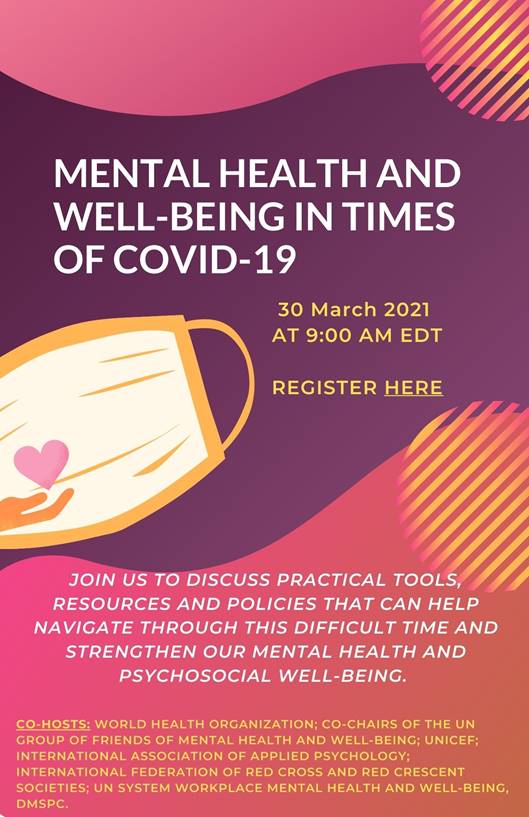Join us tomorrow for a virtual event entitled “Mental Health and Well-Being in Times of COVID-19”, co-organized by the World Health Organization; Co-Chairs of the UN Group of Friends of Mental Health and Well-being; UNICEF; International Association of Applied Psychology (IAAP); The International Federation of Red Cross and Red Crescent Societies (IFRC); UN System Workplace Mental Health and Well-being, The event will be held on 30 March 2021, from 9:00 AM - 10:15 AM EDT.