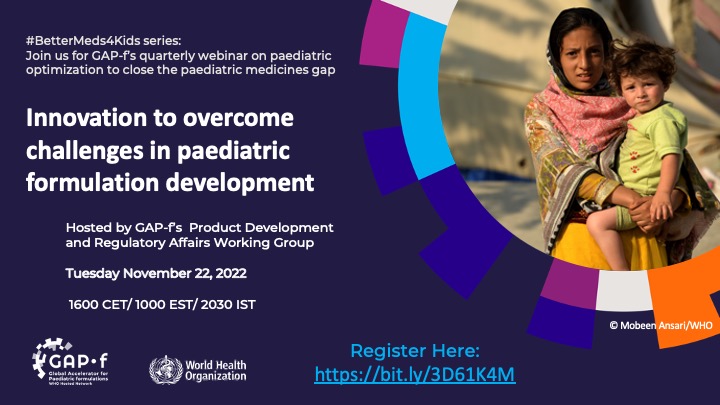 We are pleased to invite you to another webinar of the GAP-f #BetterMeds4Kids webinar series, GAP-f’s quarterly webinar series on paediatric medicines, which features deep dives in paediatric drug prioritization, evaluation, development, and delivery to promote discussions to close paediatric medicines gaps. Through GAP-f, we collect best practices across therapeutic fields and promote innovations that can help accelerate the development and use of better medicines for children. We look forward to working with you to realize this goal.