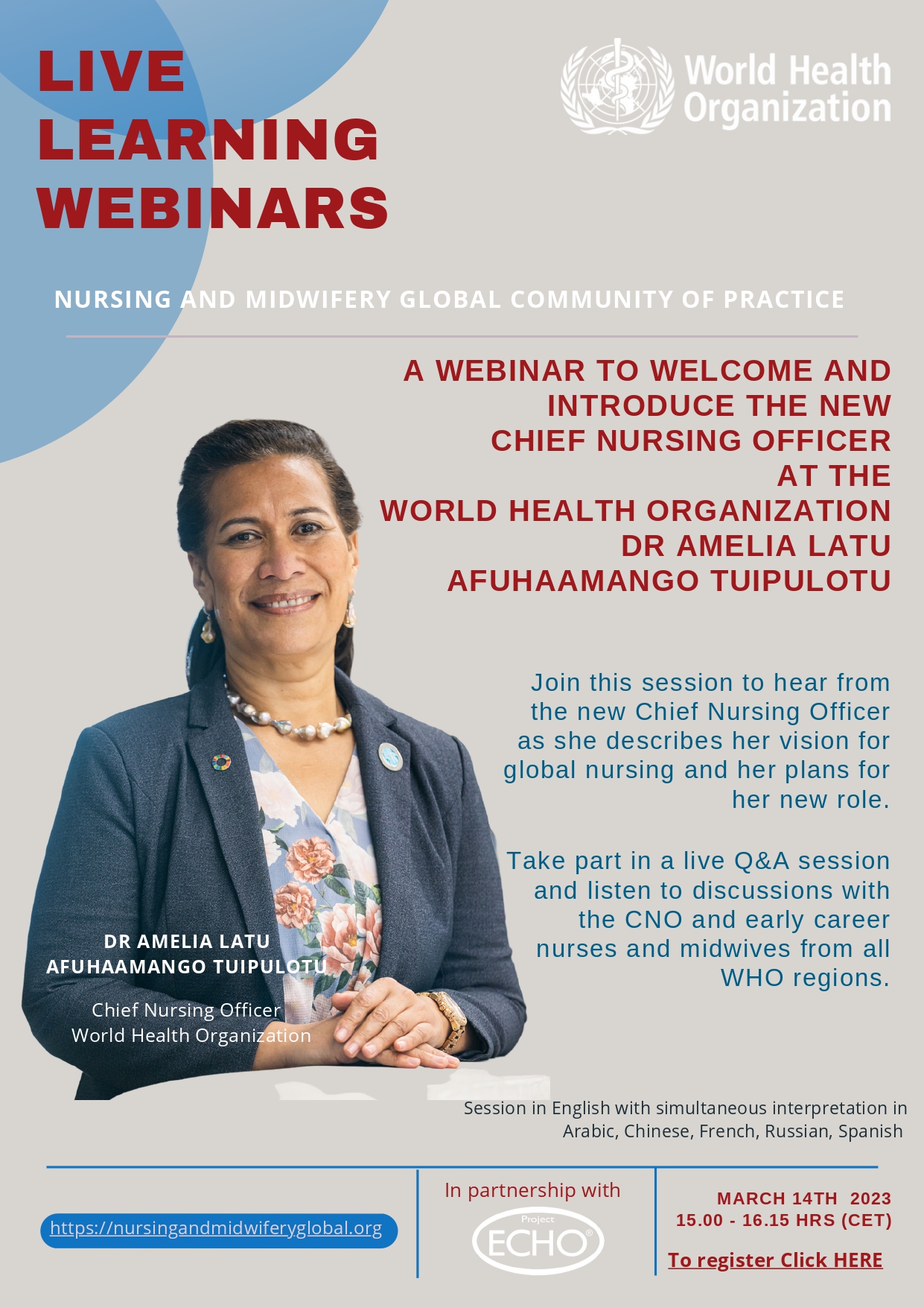 The WHO Nursing and Midwifery Global Community of Practice would like to invite you to a special webinar to introduce and welcome Dr Amelia Latu Afuhaamango Tuipulotu, the new Chief Nursing Officer at the World Health Organization.