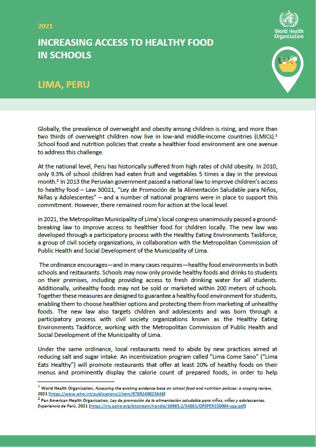 2 Pan American Health Organization, Ley de promoción de la alimentación saludable para niños, niñas y adolescentes. Experiencia de Perú, 2021 [https://iris.paho.org/bitstream/handle/10665.2/54861/OPSPER210004-spa.pdf]