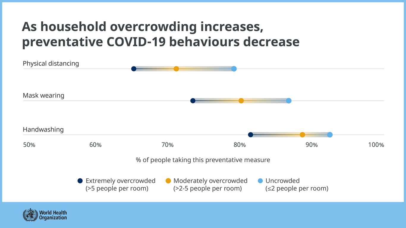 Data from the COVID-19 World Symptoms survey shows a decline in preventive behaviours such as physical distancing, mask wearing and hand washing as household overcrowding increases. Among people living in uncrowded households, 79% reported trying to physically distance themselves compared with 71% in moderately overcrowded and 65% in extremely overcrowded households. Similar trends were observed for hand washing and mask-wearing, underscoring vulnerabilities due to socioeconomic status.