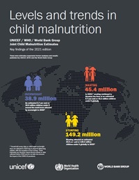 Child malnutrition estimates for the indicators stunting, wasting, overweight and underweight describe the magnitude and patterns of under- and overnutrition. UNICEF-WHO-WB Joint Child Malnutrition Estimates inter-agency group updates regularly the global and regional estimates in prevalence and numbers for each indicator. The key findings 2021 Edition includes global and regional trends and, for the first time, country-level estimates are also presented, with a summary of the enhanced methodology for deriving country-level model-based estimates for stunting and overweight. Country progress assessment towards the 2030 targets are provided with summaries by region.