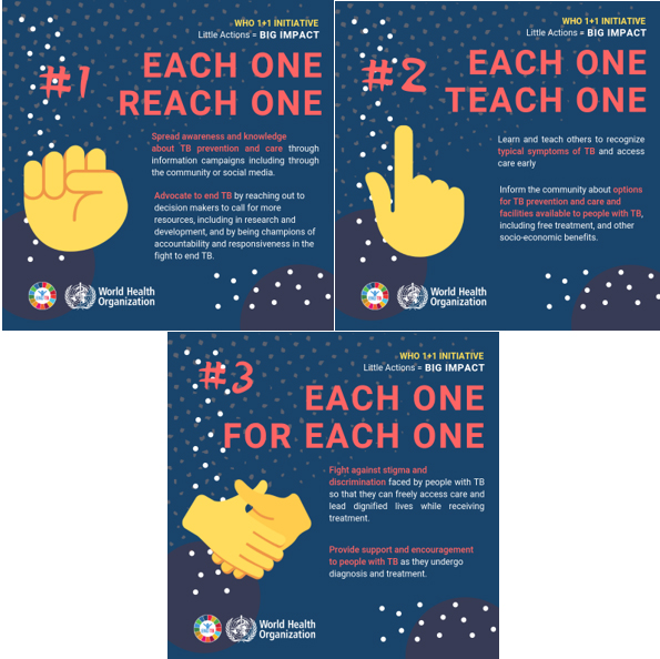 “Transforming education” is the theme of this year’s International Youth Day. It highlights efforts to make education more relevant, equitable and inclusive for all youth, including efforts by young people themselves. Raising awareness and sharing accurate and useful information about TB is also an essential part of this, and young people can play an indispensable role in this. They can help strengthen public awareness, learn and teach others to recognize typical symptoms of TB, and spread information about options for TB care and prevention. This is at the core of ‘each one teach one’, one of the suggested actions of the WHO 1+1 initiative that can have a big impact towards ending TB. Launched during World TB Day this year, 1+1 is the first youth initiative on TB. What does 1+1 equal to? You might rush to answer ‘2’, but I challenge you to consider another option: millions. If one person reaches out to another, and that person to another….we could reach the millions needed to end this epidemic.
