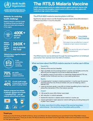 Over the last 2 years, Ministries of Health in Ghana, Kenya and Malawi have led the introduction of the RTS,S/AS01 malaria vaccine through the routine immunization platform, with the support of in-country and external partners. The vaccine requires a 4-dose regimen and is given to children from 5 months of age.