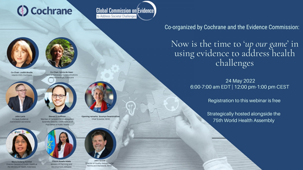 On 24 May 2022, at the margins of the 75th World Health Assembly, Cochrane and the Global Commission on Evidence to Address Societal Challenges brought together a global panel to discuss key lessons learned on using evidence in decision-making during the COVID-19 pandemic. The event was opened by the World Health Organization (WHO)’s Chief Scientist Dr. Soumya Swaminathan.