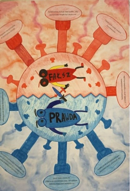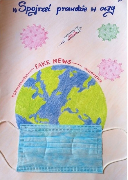 In February 2021, with support from WHO, Pravda Association organized a drawing contest entitled “To look in the eyes of truth” among 9-14-year-old children in schools across Poland, asking them to reflect on false information spreading online.