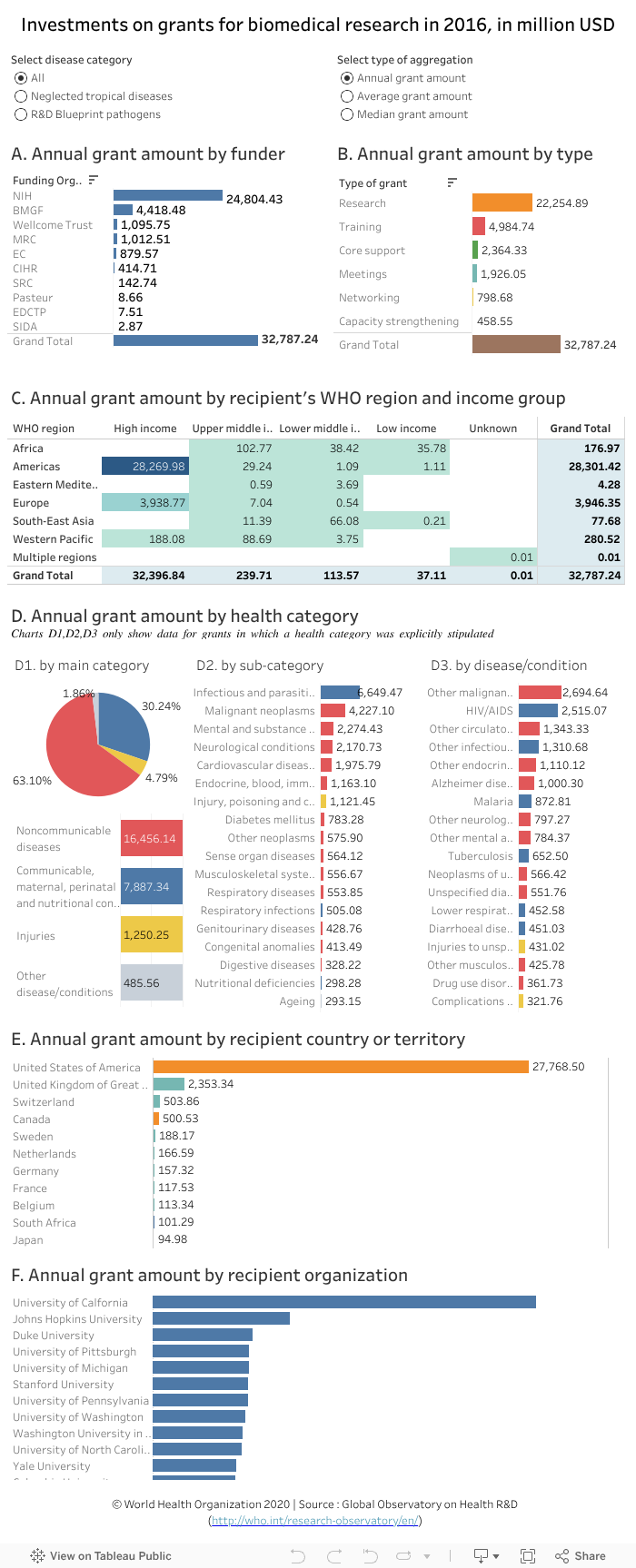 Investment figures in the World Report were available in various formats depending on the reporting practice of each funder. They varied either in terms of the currency used or the duration the grant represented: total grant for the entire duration of the project, financial disbursement for the financial year, or as the total disbursement from the start of the project until the end of the financial year. These were sometimes available with or without the actual amounts allocated to collaborating institutions. The Observatory reviewed the reporting practices of each funder and adjusted the investment figures, when needed, to the equivalent amount spanning one whole year, in this case, 2016. Grants in other currencies were converted into US$ using the World Development Indicators (WDI) official exchange rate in 2016. - Note that chart D only presents data for grants in which a health category was explicitly stipulated; other grants, amounting to approximately US$ 6.7 billion (equivalent to 20.46% of total funds and 13,780 grants), were unclassified. Data in chart