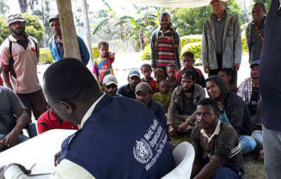 WHO staff Roland Kuuzer with provincial health workers and with people from the affected communities in Mendi, Southern Highlands.