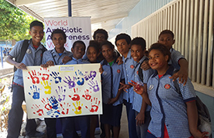Students in Port Moresby signify their commitment to be guardians of antibiotics through their handprints in celebration of Antibiotic Awareness Week.