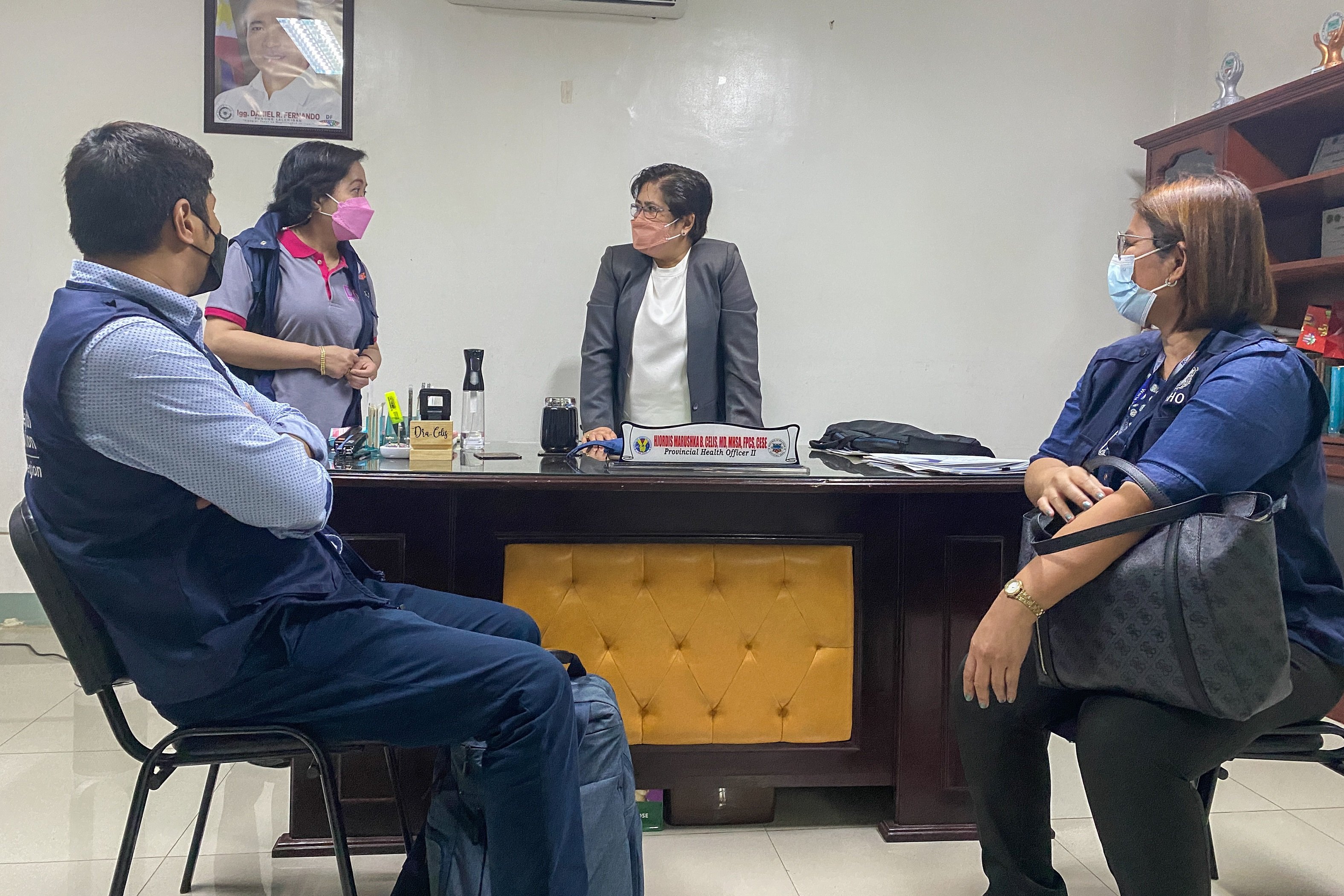 The Bulacan Provincial Health Office team, headed by Dr Hjordis Marushka Celis, shares its best practices to reach communities with the WHO team. According to Dr Celis, vaccination teams have been going to the barangay level for closer-to-home vaccinations. © WHO Philippines/K. Vitug