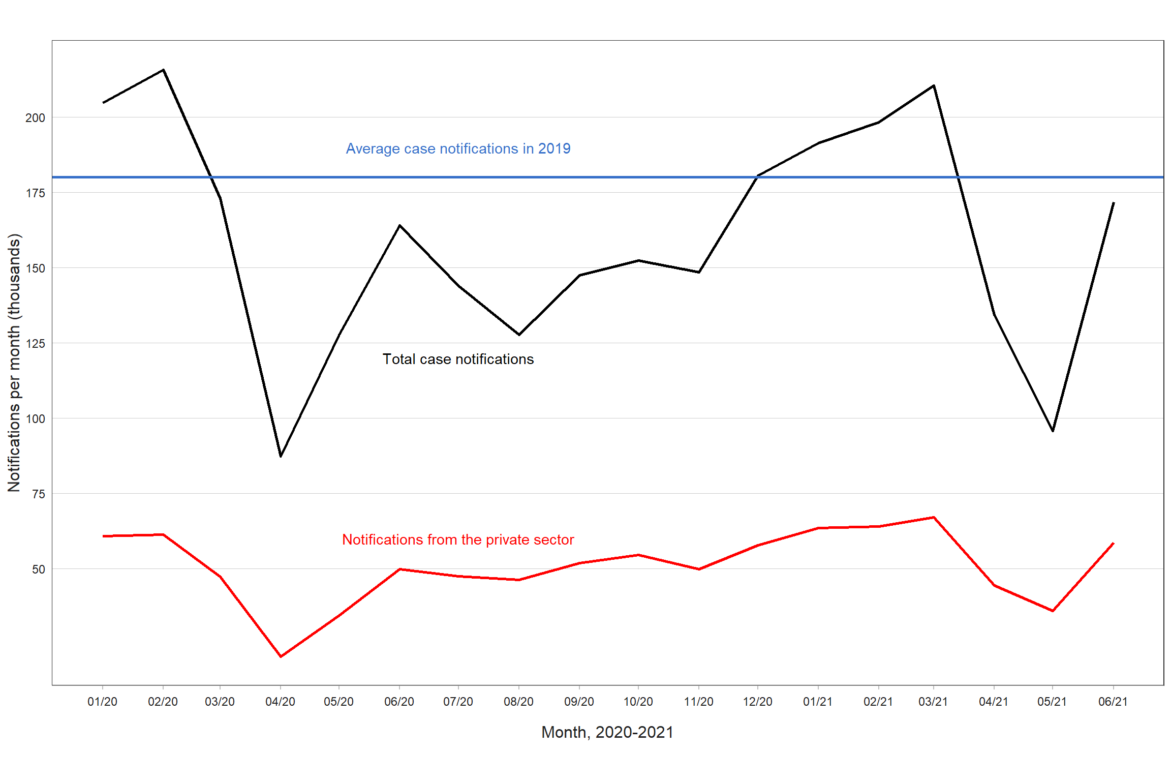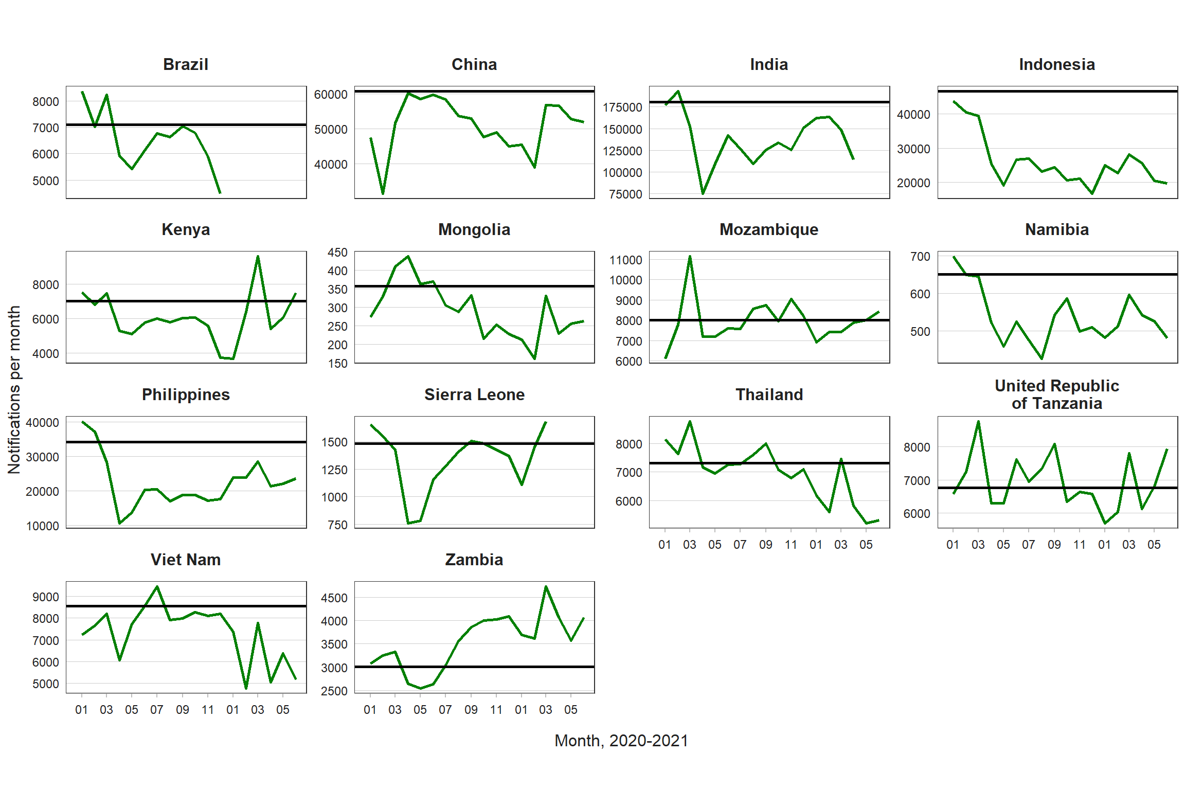 - Tuberculosis data: provisional TB notifications by month or quarter [website]. Geneva: World Health Organization; 2021 (https://www.who.int/teams/global-tuberculosis-programme/data).