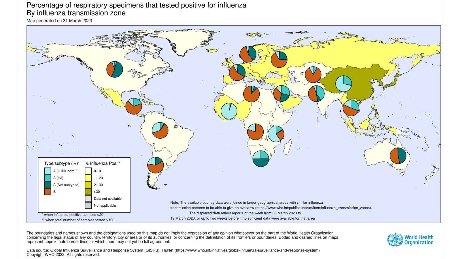 - National Influenza Centres (NICs) and other national influenza laboratories from 115 countries, areas or territories reported data to FluNet for the time period from 06 March 2023 to 19 March 2023* (data as of 3/31/2023 6:38:27 AM UTC). The WHO GISRS laboratories tested more than 349 552 specimens during that time period. 46 911 were positive for influenza viruses, of which 34 346 (73.22%) were typed as influenza A and 12 565 (26.78%) as influenza B. Of the sub-typed influenza A viruses, 20 264 (70.30%) were influenza A(H1N1)pdm09 and 8560 (29.70%) were influenza A(H3N2). Of the characterized B viruses, 100% (1479) belonged to the B/Victoria lineage.