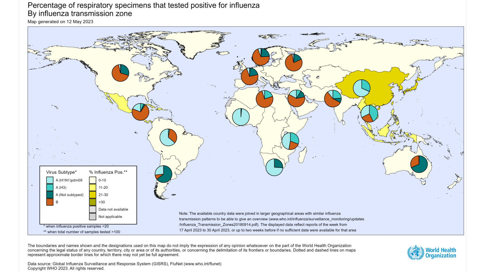 - National Influenza Centres (NICs) and other national influenza laboratories from 111 countries, areas or territories reported data to FluNet for the time period from 17 April 2023 to 30 April 2023* (data as of 12/05/2023 7:56:00 AM UTC). The WHO GISRS laboratories tested more than 266 317 specimens during that time period. 18 330 were positive for influenza viruses, of which 14 209 (77.52%) were typed as influenza A and 4 121 (22.48%) as influenza B. Of the subtyped influenza A viruses, 8816 (69.58%) were influenza A(H1N1)pdm09 and 3854 (30.42%) were influenza A(H3N2). Of the type B viruses for which lineage was determined, all 587(100%) belonged to the B/Victoria lineage.