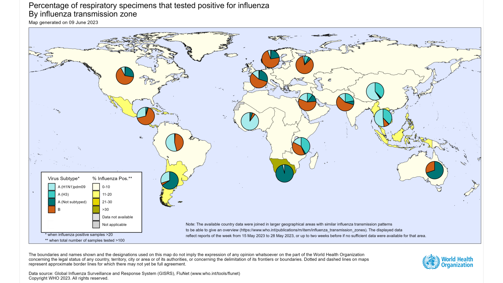 - National Influenza Centres (NICs) and other national influenza laboratories from 119 countries, areas or territories reported data to FluNet for the time period from 15 May 2023 to 28 May 2023* (data as of 09/06/2023 07:28:47 AM UTC). The WHO GISRS laboratories tested more than 328 524 specimens during that time period. 9814 were positive for influenza viruses, of which 6248 (63.7%) were typed as influenza A and 3566 (36.3%) as influenza B. Of the sub-typed influenza A viruses, 2992 (78.9%) were influenza A(H1N1)pdm09 and 799 (21.1%) were influenza A(H3N2). Of the type B viruses for which lineage was determined, all (499) belonged to the B-Victoria lineage.