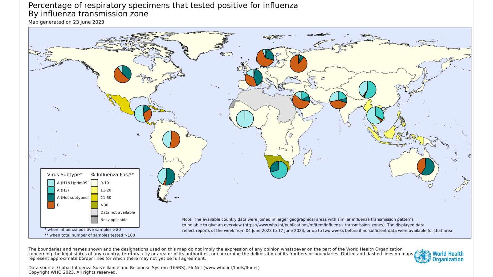 - National Influenza Centres (NICs) and other national influenza laboratories from 108 countries, areas or territories reported data to FluNet for the time period from 29 May 2023 to 11 June 2023* (data as of 23/06/2023 07:09:51 AM UTC). The WHO GISRS laboratories tested more than 262 237 specimens during that time period. 6709 were positive for influenza viruses, of which 4221 (62.9%) were typed as influenza A and 2488 (37.1%) as influenza B. Of the sub-typed influenza A viruses, 2009 (73.6%) were influenza A(H1N1)pdm09 and 719 (26.4%) were influenza A(H3N2). Of the type B viruses for which lineage was determined, all (321) belonged to the B/Victoria lineage.