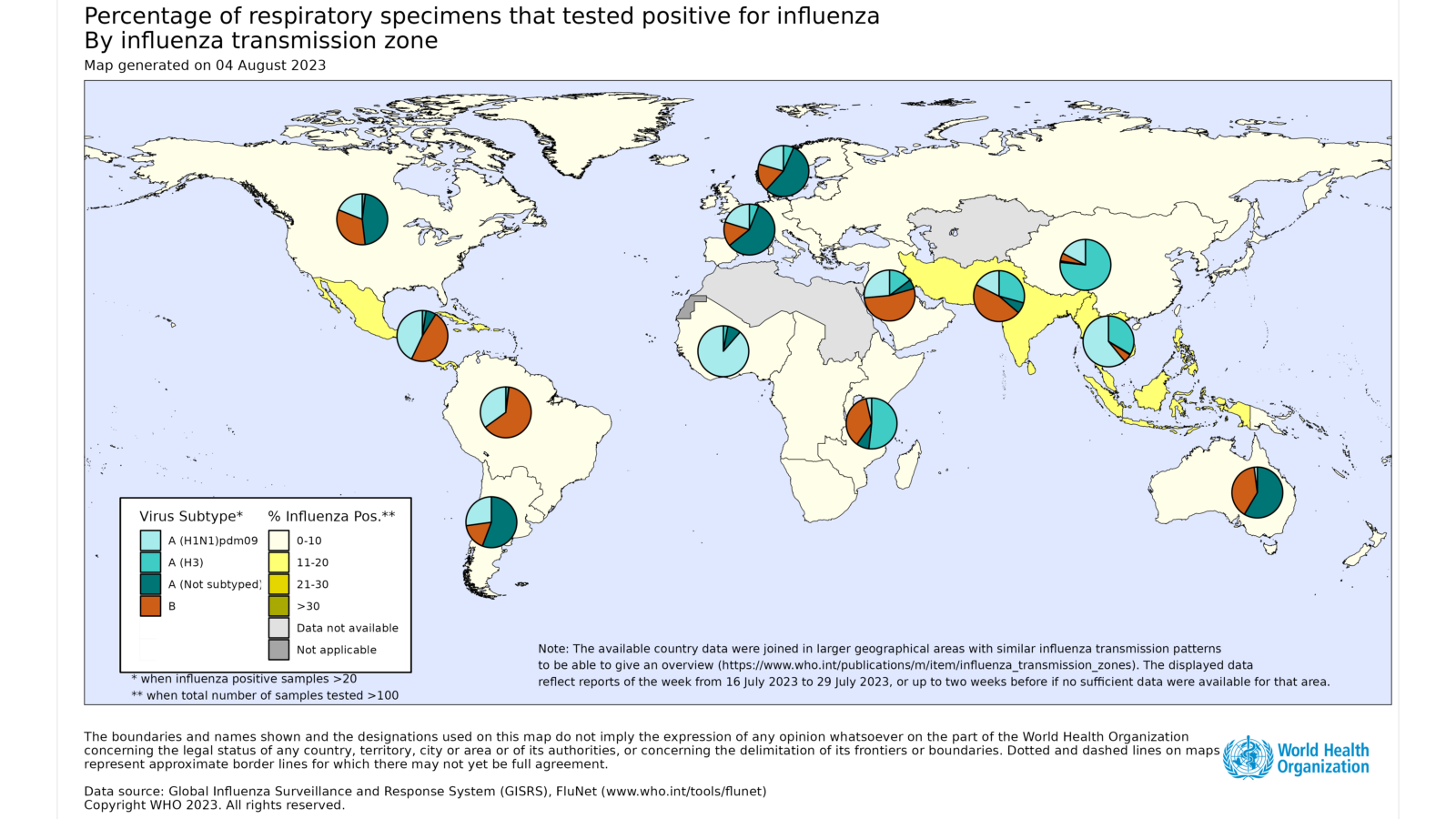 - National Influenza Centres (NICs) and other national influenza laboratories from 106 countries, areas or territories reported data to FluNet for the time period from 10 July 2023 to 23 July 2023* (data as of 04/08/2023 07:07:00AM UTC). The WHO GISRS laboratories tested more than 215 359 specimens during that time period. 5532 were positive for influenza viruses, of which 3999 (72.29%) were typed as influenza A and 1533 (27.71%) as influenza B. Of the sub-typed influenza A viruses, 1346 (51.16%) were influenza A(H1N1)pdm09 and 1285 (48.84%) were influenza A(H3N2). Of the type B viruses for which lineage was determined, all (508) belonged to the B/Victoria lineage.