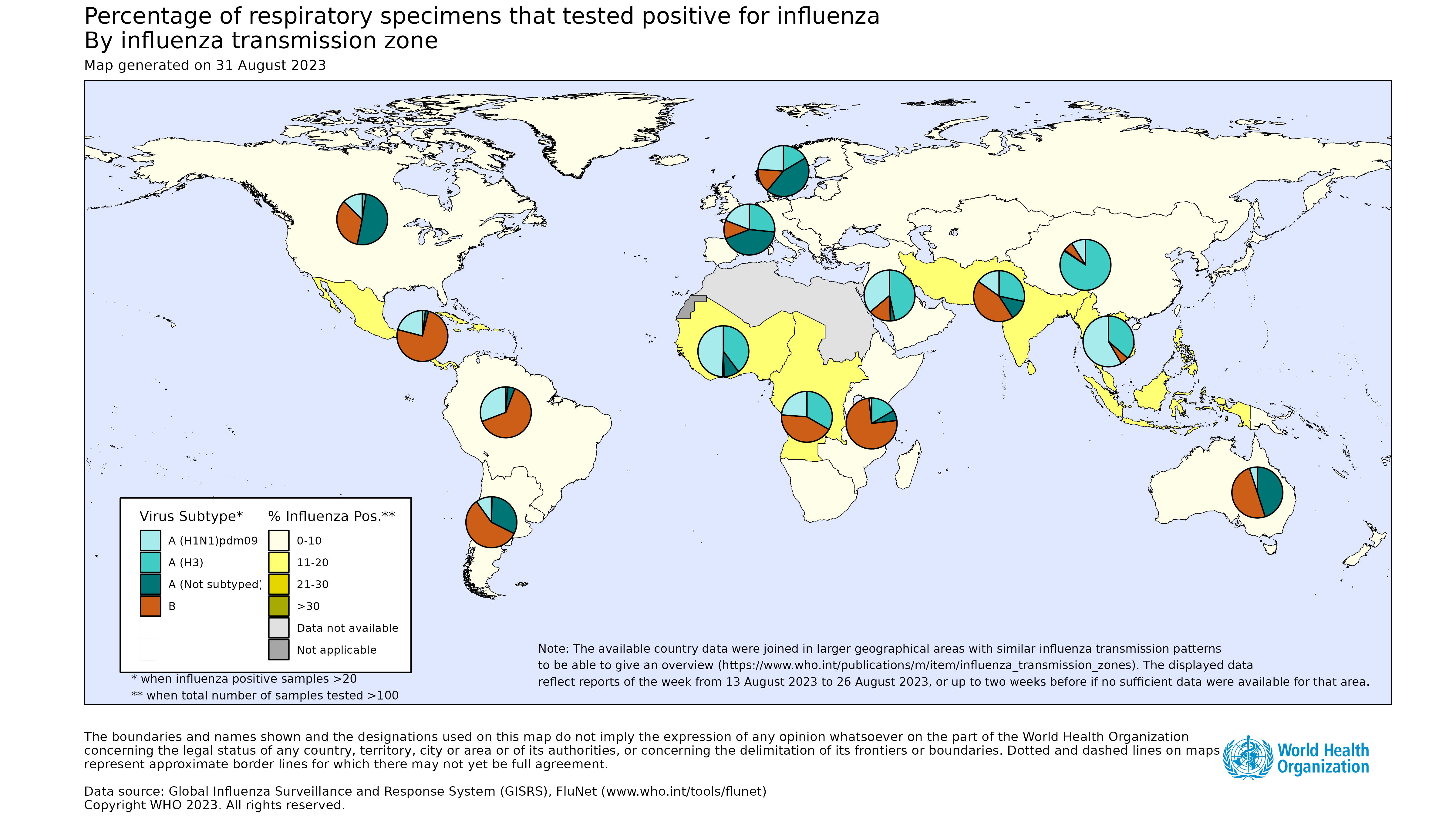 - National Influenza Centres (NICs) and other national influenza laboratories from 108 countries, areas or territories reported data to FluNet for the time period from 7 August 2023 to 20 August 2023 (data as of 31/08/2023 04:10:26 PM UTC). The WHO GISRS laboratories tested more than 230 916 specimens during that time period. 5040 were positive for influenza viruses, of which 3558 (70.6%) were typed as influenza A and 1482 (29.4%) as influenza B. Of the sub-typed influenza A viruses, 991 (38.0%) were influenza A(H1N1)pdm09 and 1617 (62.0%) were influenza A(H3N2). Of the type B viruses for which lineage was determined, all (560) belonged to the B/Victoria lineage.