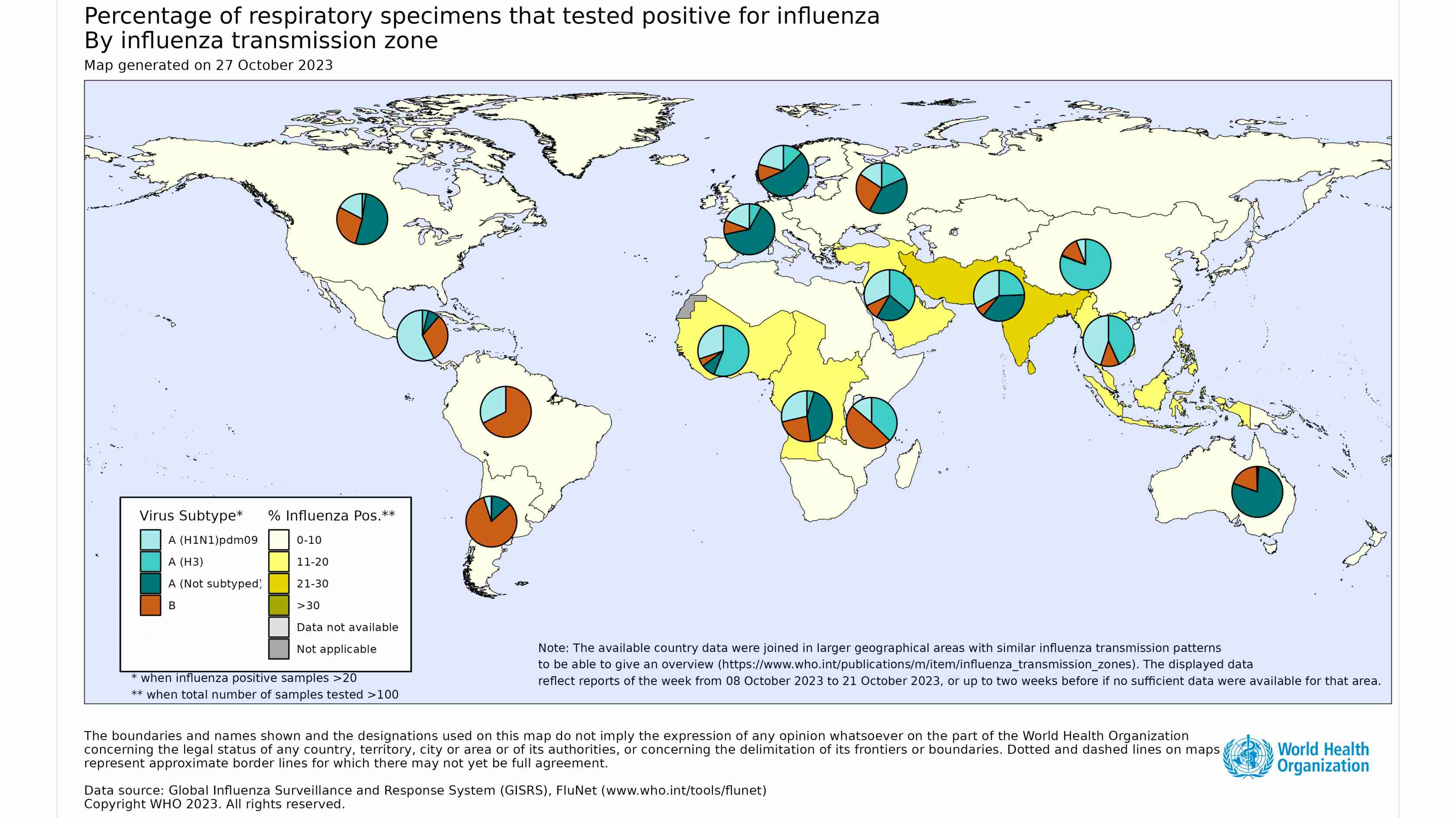 - National Influenza Centres (NICs) and other national influenza laboratories from 124 countries, areas or territories reported data to FluNet for the period from 02 October 2023 to 15 October 2023 (data as of 27/10/2023 06:38:45 AM UTC). The WHO GISRS laboratories tested more than 357 752 specimens during that period. 11 470 were positive for influenza viruses, of which 9518 (83.0%) were typed as influenza A and 1952 (17.02%) as influenza B. Of the sub-typed influenza A viruses, 2239 (32.8%) were influenza A(H1N1)pdm09 and 4582 (67.2%) were influenza A(H3N2). Of the type B viruses for which lineage was determined, all (902) belonged to the B/Victoria lineage.