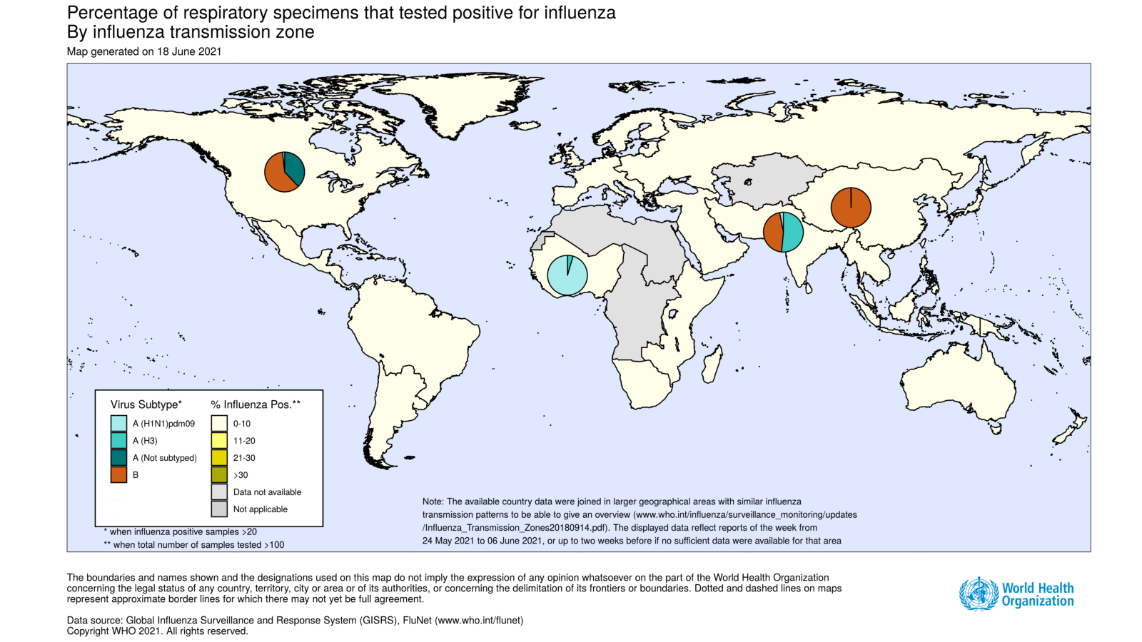 - National Influenza Centres (NICs) and other national influenza laboratories from 78 countries, areas or territories reported data to FluNet for the time period from 24 May 2021 to 06 June 2021 (data as of 2021-06-18 06:59:38 UTC). The WHO GISRS laboratories tested more than 228646 specimens during that time period. 965 were positive for influenza viruses, of which 69 (7.2%) were typed as influenza A and 896 (92.8%) as influenza B. Of the sub-typed influenza A viruses, 24 (55.8%) were influenza A(H1N1)pdm09 and 19 (44.2%) were influenza A(H3N2). Of the characterized B viruses, 2 (0.2%) belonged to the B-Yamagata lineage and 830 (99.8%) to the B-Victoria lineage.