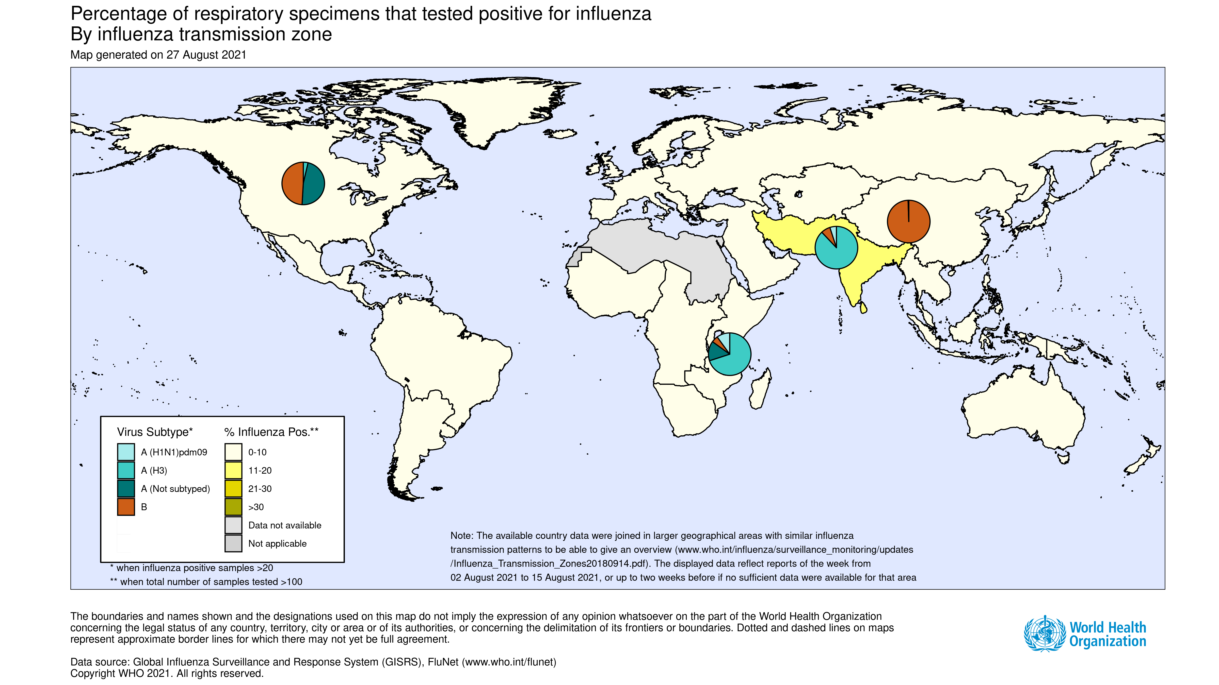 - National Influenza Centres (NICs) and other national influenza laboratories from 81 countries, areas or territories reported data to FluNet for the time period from 02 August 2021 to 15 August 2021* (data as of 2021-08-27 07:16:44 UTC).The WHO GISRS laboratories tested more than 215 281 specimens during that time period. 1424 were positive for influenza viruses, of which 927 (65.1%) were typed as influenza A and 497 (34.9%) as influenza B. Of the sub-typed influenza A viruses, 55 (6.2%) were influenza A(H1N1)pdm09 and 830 (93.8%) were influenza A(H3N2). Of the 455 characterized B viruses, 100% belonged to the B-Victoria lineage.