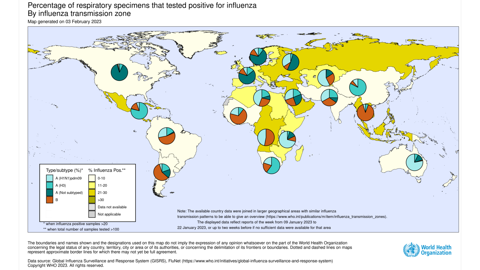 - National Influenza Centres (NICs) and other national influenza laboratories from 127 countries, areas or territories reported data to FluNet for the time period from 09 January 2023 to 22 January 2023 * (data as of 2023-02-03 08:09:25 UTC). The WHO GISRS laboratories tested more than 367 930 specimens during that time period. 30 044 were positive for influenza viruses, of which 24878 (82.8%) were typed as influenza A and 5166 (17.2%) as influenza B. Of the sub-typed influenza A viruses, 4509 (58.6%) were influenza A(H1N1)pdm09 and 3192 (41.4%) were influenza A(H3N2). Of the characterized B viruses (592), 100% belonged to the B-Victoria lineage.