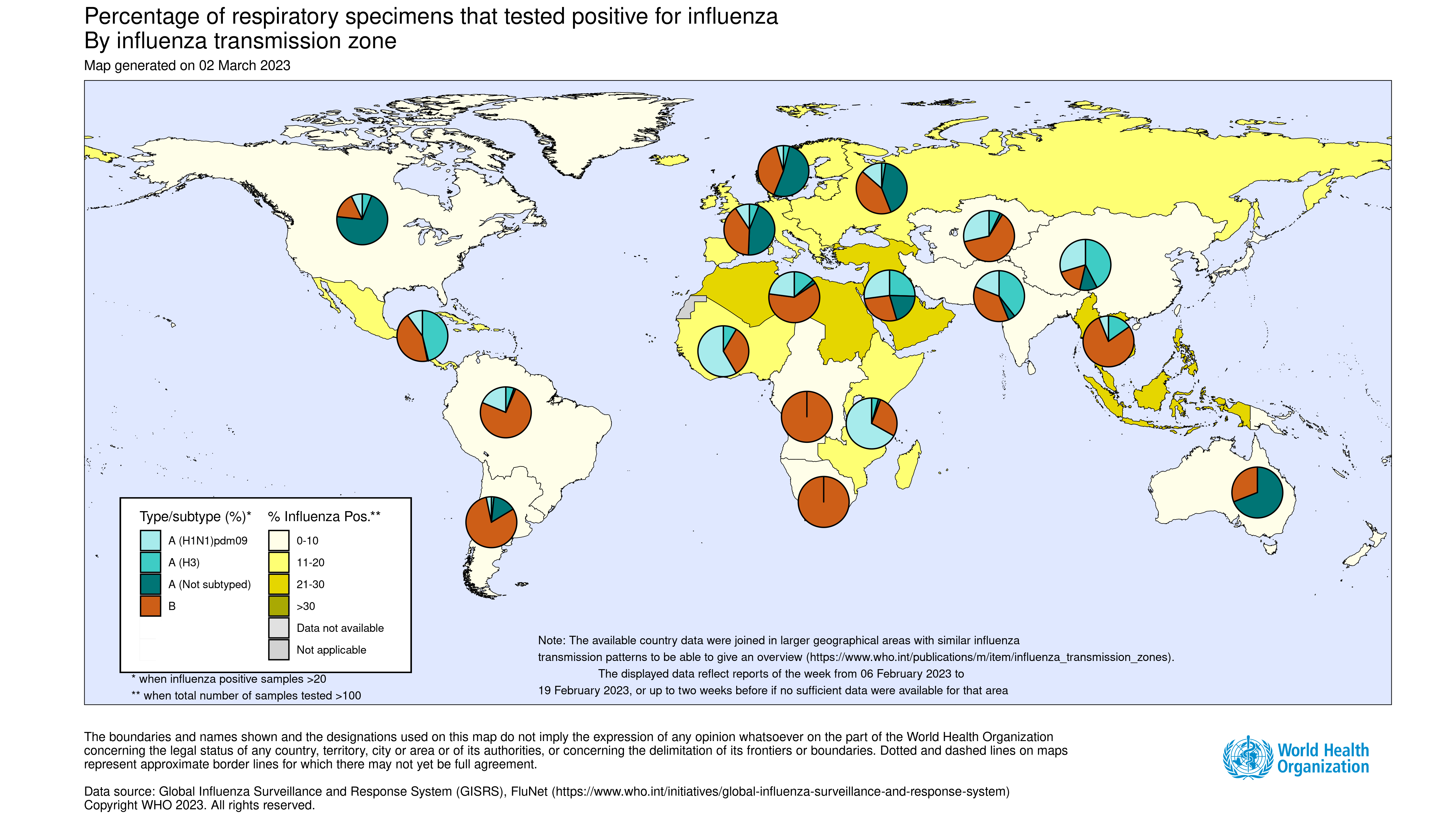 - National Influenza Centres (NICs) and other national influenza laboratories from 112 countries, areas or territories reported data to FluNet for the time period from 06 February 2023 to 19 February 2023 (data as of 2023-03-10 10:39:46 UTC). The WHO GISRS laboratories tested more than 452 053 specimens during that time period. 31912 were positive for influenza viruses, of which 18760 (58.8%) were typed as influenza A and 13152 (41.2%) as influenza B. Of the sub-typed influenza A viruses, 4159 (66.2%) were influenza A(H1N1)pdm09 and 2144 (33.8%) were influenza A(H3N2). Of the characterized B viruses, 100% (1094) belonged to the B/Victoria lineage.