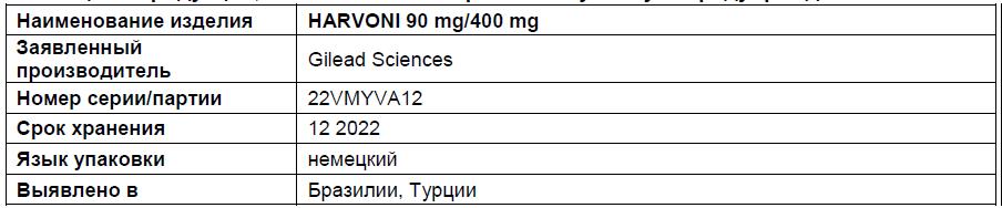 - настоящий производитель HARVONI компания Gilead Sciences подтвердила, что не производила и не распространяла продукцию, описываемую в настоящем предупреждении ВОЗ № 7/2020;