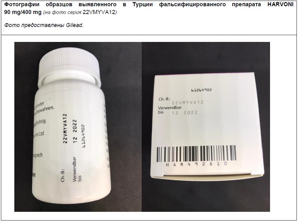 Фальсифицированный препарат Harvoni был обнаружен в Бразилии в мае 2020 г. и в Турции в ноябре 2020 г. Недавно ВОЗ получила информацию о том, что данная продукция остается в обороте. Согласно имеющейся информации, данные фальсифицированные препараты были выявлены на этапе отпуска пациентам.