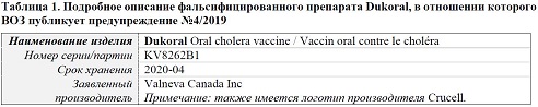Недавно ВОЗ получила от производителя Valneva информацию о том, что в Бангладеш распространяются 8 000 упаковок фальсифицированной пероральной противохолерной вакцины Dukoral. Страновое бюро ВОЗ и органы здравоохранения в Бангладеш изъяли из оборота выявленные к настоящему моменту фальсифицированные вакцины.