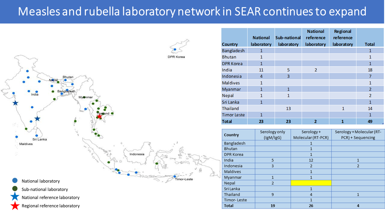 The South East Asia Regional MR Laboratory Network was established by 2003 as integral part of the WHO Global MR Laboratory Network. SEAR laboratory network has expanded from 23 laboratories in 2013 to 49 in 2021 with at least 26 MR laboratories conducting both serology and RT-PCR for measles and rubella and four laboratories also conducting sequencing. To ensure that each laboratory is recognized as “proficient”, an onsite accreditation review of laboratory practices is conducted annually.