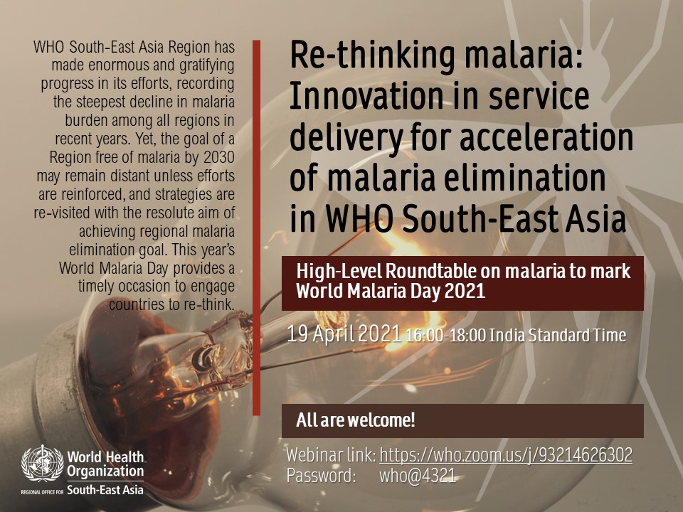 WHO South-East Asia Region has made enormous and gratifying progress in its efforts, recording the steepest decline in malaria burden among all regions in recent years. Yet, the goal of a Region free of malaria by 2030 may remain distant unless efforts are reinforced, and strategies are re-visited with the resolute aim of achieving regional malaria elimination goal. This year’s World Malaria Day provides a timely occasion to engage countries to re-think. The virtual high-level roundtable would bring together senior government officials, scientists, public health experts and partners to discuss the scientific, socio-economic and policy dimensions of eliminating malaria, with a stronger focus on sub-national elimination, governance and financing.