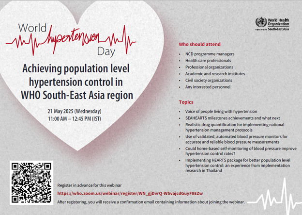 As part of the commitment to resolution SEAHEARTS: Accelerating Prevention and Control of Cardiovascular Diseases in the South-East Asia Region (SEA/RC76/R5), countries have set-up national targets to improve the hypertension coverage and are implementing interventions aligned to WHO HEARTS technical package in the primary health care. Each country is in different stage of progress, and several shared challenges persists. World Hypertension Day serves as a vital platform to unite stakeholders across sectors to reflect on progress and explore solutions to the challenges of hypertension prevention and control. To mark this occasion, the Department of Healthier Population and Noncommunicable Diseases (HPN) at the WHO South-East Asia Regional Office is organizing a public webinar. The event will focus on sharing practical approaches to scale up hypertension treatment coverage and improve control across the region.