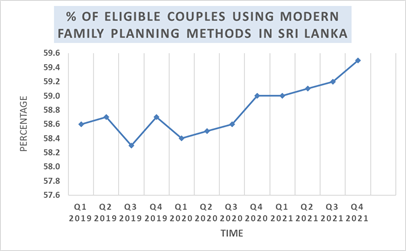 The Sri Lanka Demographic Health Survey (2016) reports a contraceptive prevalence rate as 65%, with 54% of users using a modern method. COVID-19 pandemic had caused unprecedented impact on all health services and family planning services is no exception. Three rounds of Pulse Survey on continuity of essential health services conducted by World Health Organization (WHO) revealed that family planning services had been significantly impacted in approximately one third of countries. Sri Lanka also followed the global trend with 5-25% service disruptions related to family planning service delivery by the end of 2021.