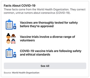 Facebook has also directed billions of people globally to resources from the WHO and other health authorities through their COVID-19 Information Center and informative pop-ups on Facebook and Instagram, with hundreds of millions clicking through to learn more from trusted sources.