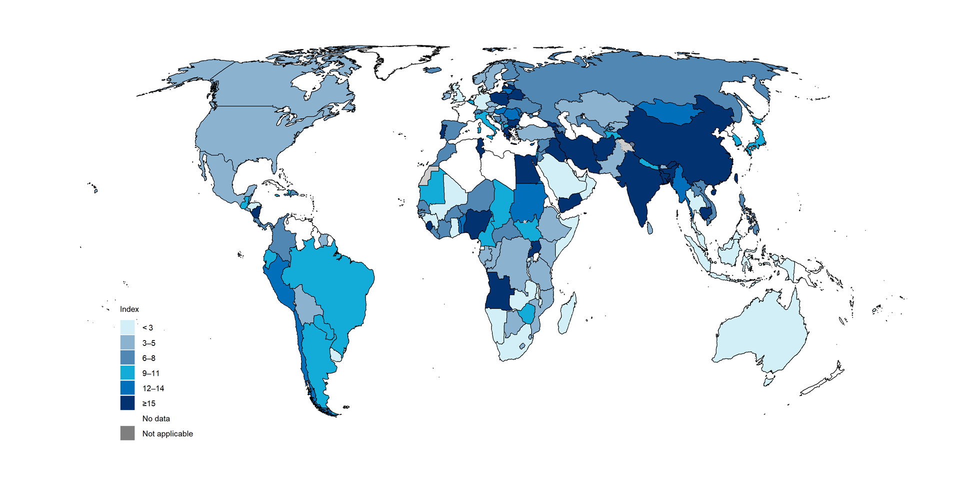 Across all countries, there was a great deal of variation in the SCI in 2021 (Fig. 5.1.3). The highest values were in high-income countries in North America, western Europe and parts of the WHO Western Pacific Region; the lowest values were predominantly in countries in the WHO African Region.