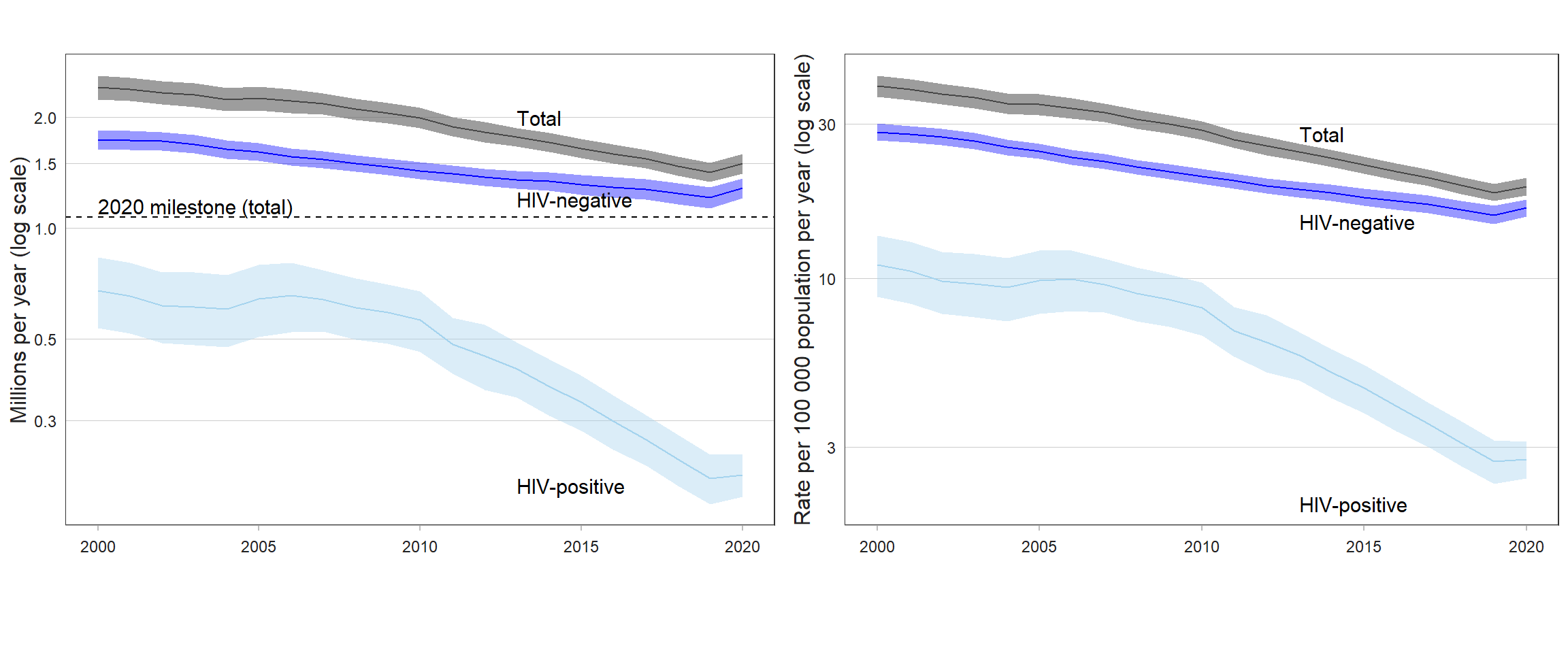 Estimated TB mortality rates among HIV-negative people are shown in blue and estimated mortality rates among HIV-positive people are shown in light blue. Shaded areas represent uncertainty intervals.