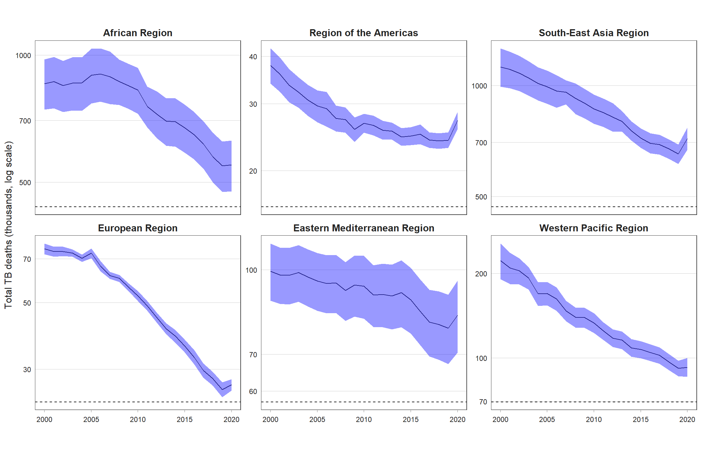 Shaded areas represent uncertainty intervals. The horizontal dashed line shows the 2020 milestone of the End TB Strategy.