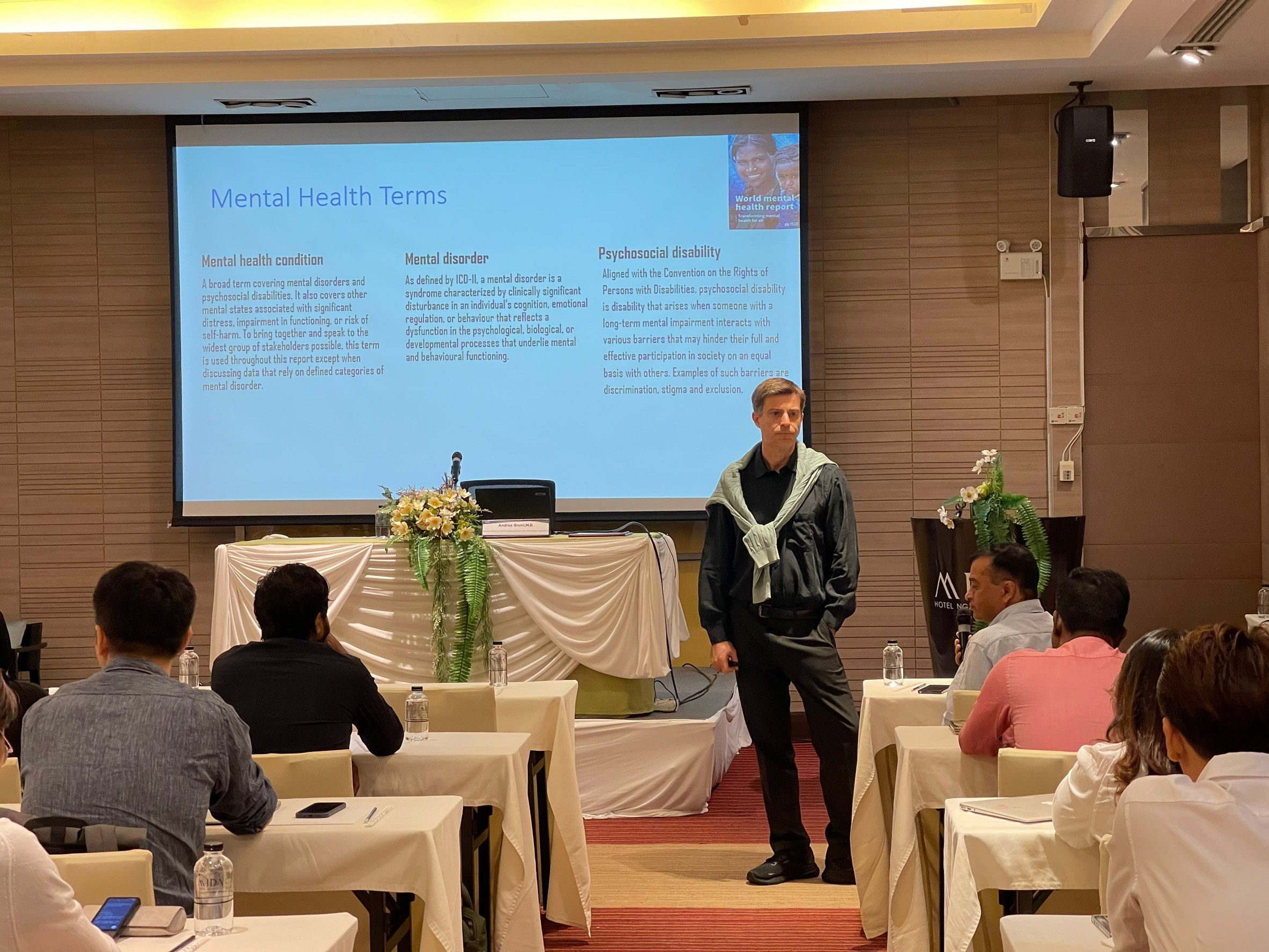 Dr. Andrea Bruni, WHO SEARO Mental Health Regional Advisor, gives a lecture on the mental health situation in South-East Asia, highlighting the Paro Declaration and the Mental Health Action Plan 2023-2030. © WHO Thailand 2024