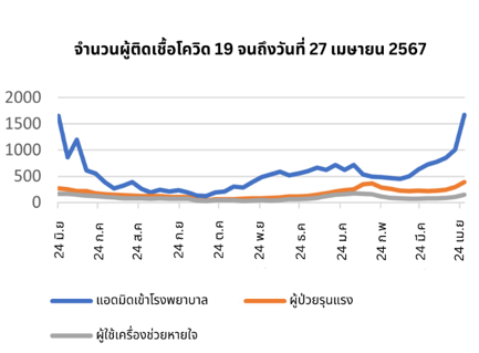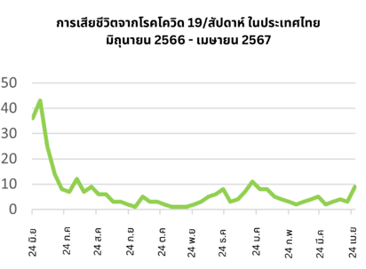 ตั้งแต่เดือนมีนาคม 2567 ข้อมูลจากกระทรวงสาธารณสุขที่รายงานเป็นรายสัปดาห์บ่งชี้ว่า จำนวนผู้ป่วยที่เข้ารับการรักษาในโรงพยาบาลเนื่องจากโรคติดเชื้อไวรัสโคโรนา 2019 (โควิด 19) มีแนวโน้มเพิ่มขึ้น ข้อมูลล่าสุดแสดงให้เห็นถึงผู้ป่วยใหม่ 1,672 รายมีผู้เสียชีวิต 9 รายในสัปดาห์ที่ผ่านมา ผู้ป่วยที่อาการหนัก 390 ราย และมีจำนวน 148 รายที่ต้องใช้เครื่องช่วยหายใจ ณ วันที่ 27 เมษายน ยังไม่มีหลักฐานที่ชี้ว่าสายพันธุ์โควิด 19 ปัจจุบันทำให้เกิดอาการป่วยรุนแรงขึ้น แต่การเพิ่มขึ้นของจำนวนผู้ป่วยในประเทศไทยน่าจะเป็นผลมาจากการแพร่กระจายของเชื้อไวรัสในปัจจุบันที่มีการแพร่เชื้อสูงขึ้นและการยึดมั่นในมาตรการป้องกันส่วนบุคคลที่ลดลง รวมถึงในช่วงเทศกาลสงกรานต์ด้วย นอกจากนี้ยังมีคนจำนวนไม่น้อยในประเทศไทยที่ยังไม่ได้รับวัคซีนหรือได้รับวัคซีนไม่ครบถ้วน