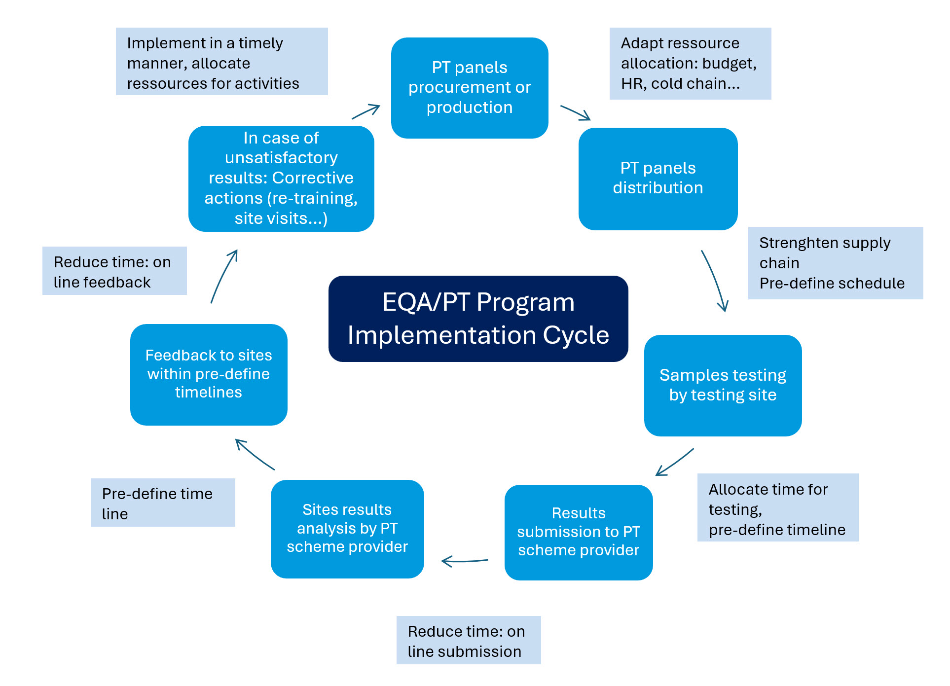 EQA is usually presented as a set of 3 different activities: site assessment/on-site supportive supervision visit, Proficiency Testing (PT) program, and cross-checking.