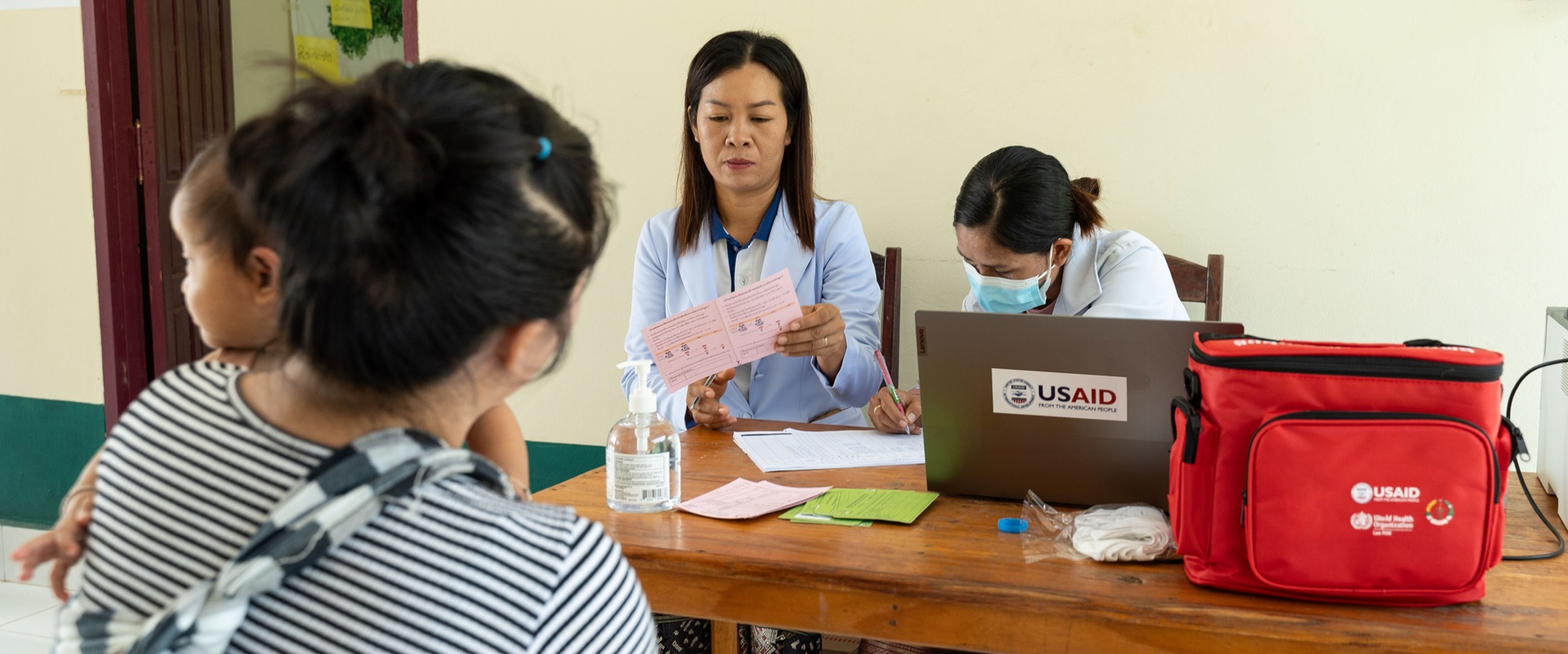 Mother bringing her daughter for routine vaccination at Nachaleurn Health Centre in Lao People's Democratic Republic.