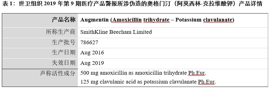 本医疗产品警报涉及在乌干达和肯尼亚发现的确认伪造奥格门汀(阿莫西林-克拉维酸钾)。 应当指出,这是世卫组织就非洲区域伪造奥格门汀发布的第二份医疗产品警报。2018年3月2日发布了第一份 世卫组织医疗产品警报第2期/2018.